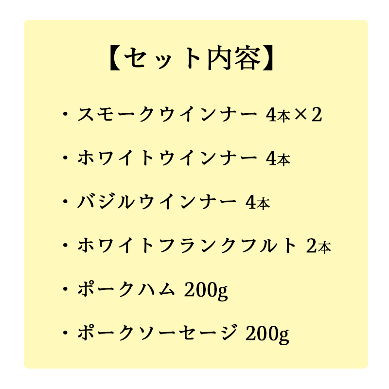 商品詳細名称ハム・ソーセージ三昧 セット内容 ・スモークウインナー 100g(4本)×2 ・ホワイトウインナー 100g(4本) ・バジルウインナー 100g(4本) ・ホワイトフランクフルト 150g(2本) ・ポークハム 200g ・ポークソーセージ 200g 原材料 ・スモークウインナー:豚肉(黒豚 鹿児島県産)、食塩、糖類(水飴、砂糖(洗双糖))、魚醤、にんにく、香辛料、粉末昆布、(原材料の一部にさけを含む) ・ホワイトウインナー:豚肉(黒豚 鹿児島県産)、食塩、糖類(水飴・砂糖(洗双糖))、玉葱、香辛料、魚醤(さけを含む)、昆布粉末 ・バジルウインナー:豚肉(黒豚 鹿児島県産)、食塩、砂糖(洗双糖)、香辛料、魚醤(さけを含む)、レモン果汁、昆布粉末 ・ホワイトフランクフルト:豚肉(黒豚 鹿児島県産)・食塩・砂糖(洗双糖)・香辛料・魚醤・生姜・粉末昆布、(原材料の一部にさけを含む) ・ポークハム:豚肉(黒豚 鹿児島県産)、食塩、糖類(水飴・砂糖(洗双糖))、魚醤 (さけを含む)、にんにく、香辛料、昆布粉末 ・ポークソーセージ:豚肉(黒豚 鹿児島県産)、食塩、糖類(水飴・砂糖(洗双糖))、魚醤(さけを含む)、にんにく、香辛料、粉末昆布 原産国日本原産地鹿児島賞味期限冷凍120日・冷蔵10日保存方法-18℃以下で保存して下さい配送温度帯冷凍製造者有限会社 鹿児島ますや鹿児島県姶良市西餅田303番1 季節のギフトとして お歳暮 御歳暮 お中元 御中元 夏ギフト お歳暮ギフト 御歳暮ギフト 冬ギフト 帰歳暮 帰省暮 帰省土産 お年賀 御年賀 年賀 お年始 御年始 年始挨拶 年末 年始 大晦日 正月 母の日 父の日 敬老の日 おせち お節 御節 クリスマス 初節句 七五三 寒中見舞い 寒中お見舞い 暑中見舞い 暑中お見舞い 残暑見舞い お盆 送別 お祝いとして お祝い 御祝い 御祝 お祝い返し 結婚 結婚祝い 結婚お祝い 出産祝い 出産お祝い 就職祝い 引っ越し祝い 快気祝い 快気御祝い 全快祝い 開店祝い 昇進祝い 新築祝い 上棟祝い 開店祝い 退職祝い 快気祝い 初老祝い 還暦祝い 古稀祝い 喜寿祝い 傘寿祝い 米寿祝い 卒寿祝い 白寿祝い 白寿祝いお返し 長寿祝い 長寿祝いお返し 入園祝い 入学祝い 卒園祝い 卒業祝い 進学祝い 入園祝い 入学祝い 卒園祝い 卒業祝い 成人式 就職祝い 内祝いとして 内祝 内祝い 結婚内祝い 出産内祝い 引越し内祝い 快気内祝い 開店内祝い 入園内祝い 入学内祝い 卒園内祝い 卒業内祝い 進学内祝い こんなお相手に 家族 親族 祖父母 祖父 おじいちゃん 祖母 おばあちゃん 両親 父 父親 お父さん パパ 母 母親 お母さん ママ 兄弟 姉妹 友人 友達 知人 子供 会社 職場 その他色々なご用途でお使いいただけます 贈答 贈答品 贈り物 贈物 ギフト gift ギフトセット セット 詰め合わせ 詰合せ つめあわせ プレゼント 手土産 土産 おみやげ お返し お礼 御礼 お取り寄せ お取り寄せグルメ グルメ ご飯のお供 ごはんのおとも お酒のお供 ビールのお供 酒の肴 ごあいさつ ご挨拶 御挨拶 金婚式 銀婚式 結婚記念日 見舞 お見舞い お見舞返し お見舞いお返し 記念日 誕生日ディナー オードブル パーティー 家飲み 家飲みセット リモート飲み会 リモートごはん リモートディナー オンライン飲み会 オンラインごはん 記念品 定年退職記念品 コンペ景品 景品 賞品 粗品 ノベルティ 記念品 成約記念 香典 香典返し お香典返し 志引き出物 引出物 肉 お肉 豚 豚肉 惣菜 お肉惣菜 お肉料理 おつまみ おかず 食品 食べ物 冷凍 保存用 ストック おすすめ 上品 高級 長期保存 鹿児島 鹿児島県 九州 国産 鹿児島ますや本店